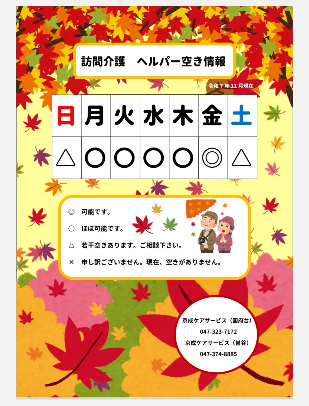 11月のヘルパー空き情報です!🍂