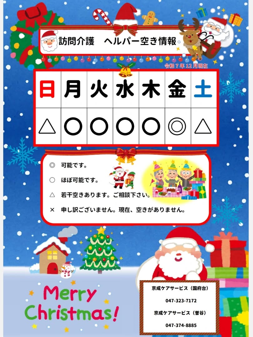 12月のヘルパー空き情報です!🎅✨